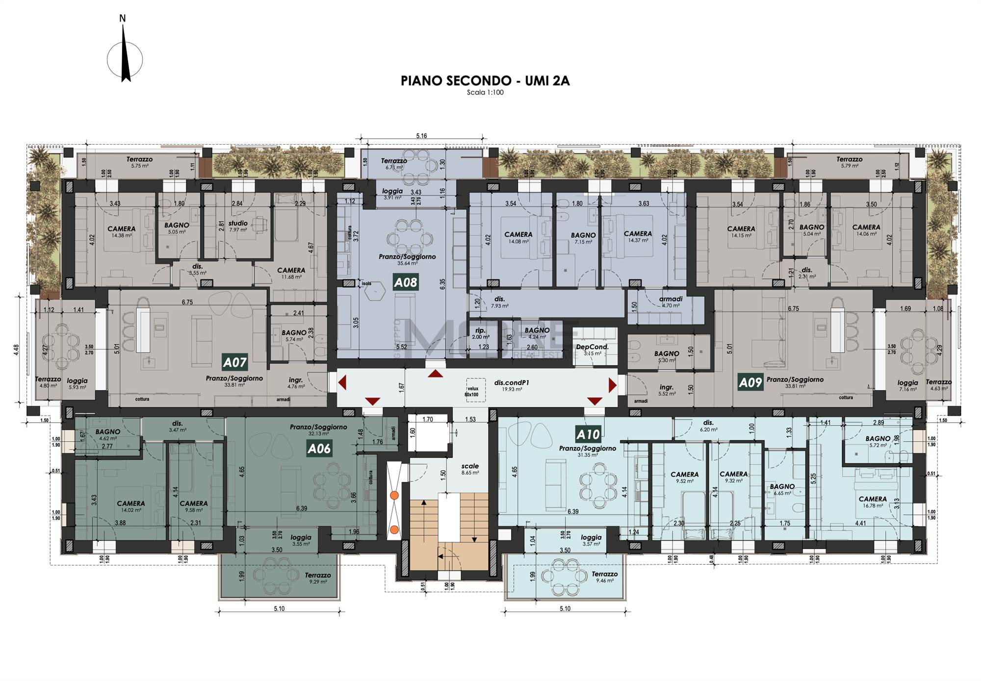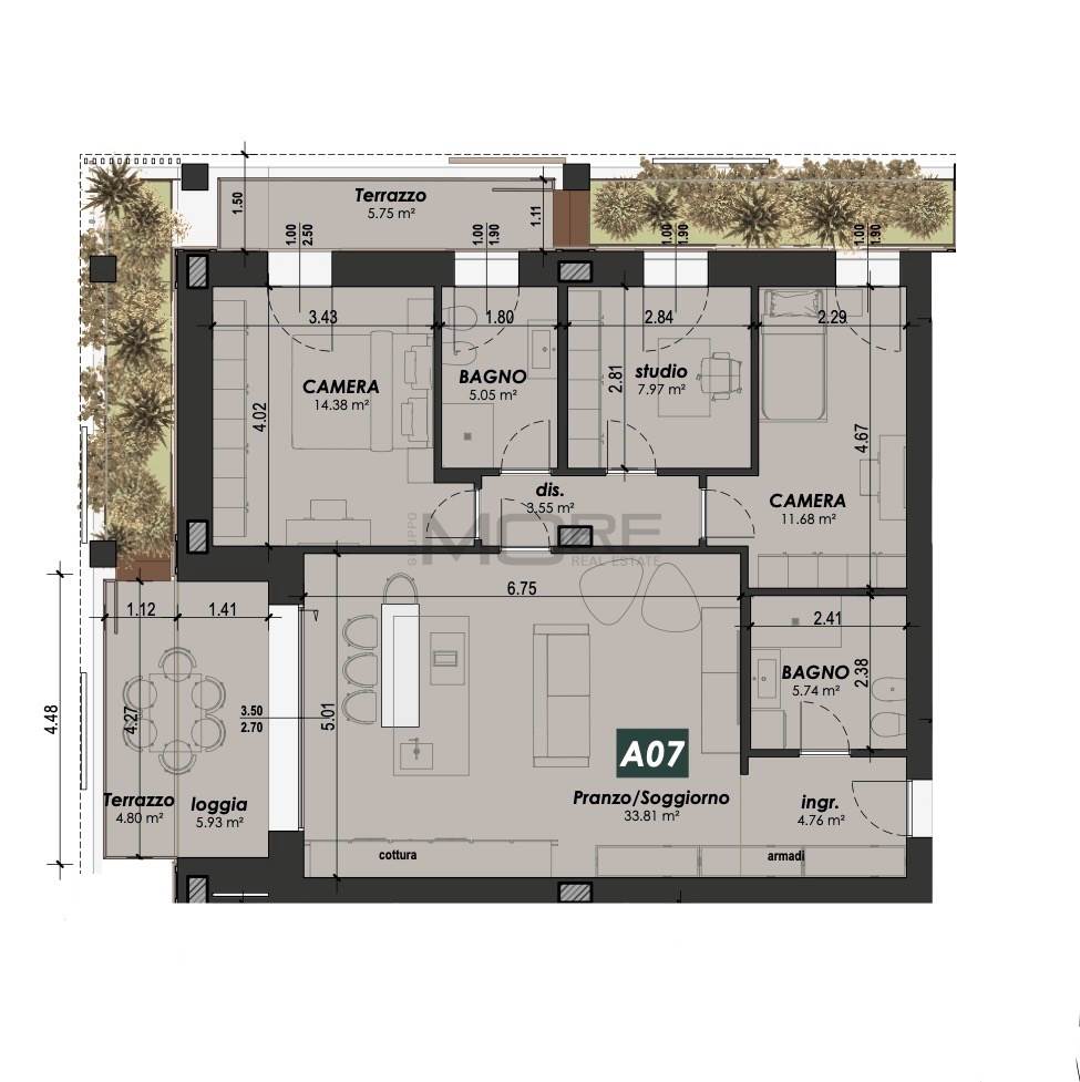 App.to così disposto: ingresso, soggiorno con sbocco sul terrazzo e giardino pensile, cucina a vista, bagno cieco, dis. notte, due camere da letto, uno studio, bagno finestrato e secondo terrazzo con giardino pensile.