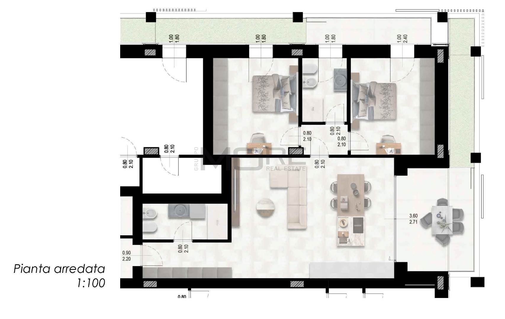 App.to così disposto: ingresso, soggiorno con sbocco sul terrazzo e giardino pensile, cucina a vista, bagno cieco, dis. notte, due camere da letto, bagno finestrato e secondo terrazzo con ulteriore giardino pensile.