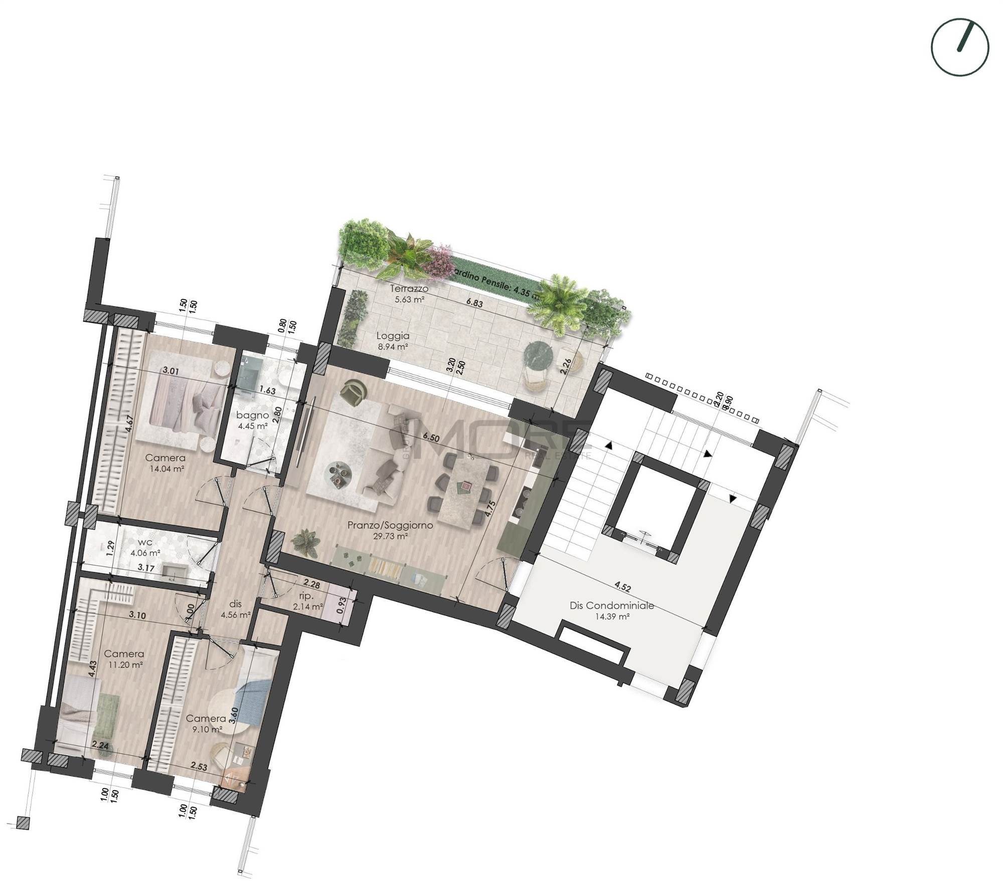 Appartamento così disposto: soggiorno/pranzo con cucina a vista, loggia coperta, giardino pensile, disimpegno, 3 camere da letto, due bagni (di cui uno cieco) e ripostiglio.