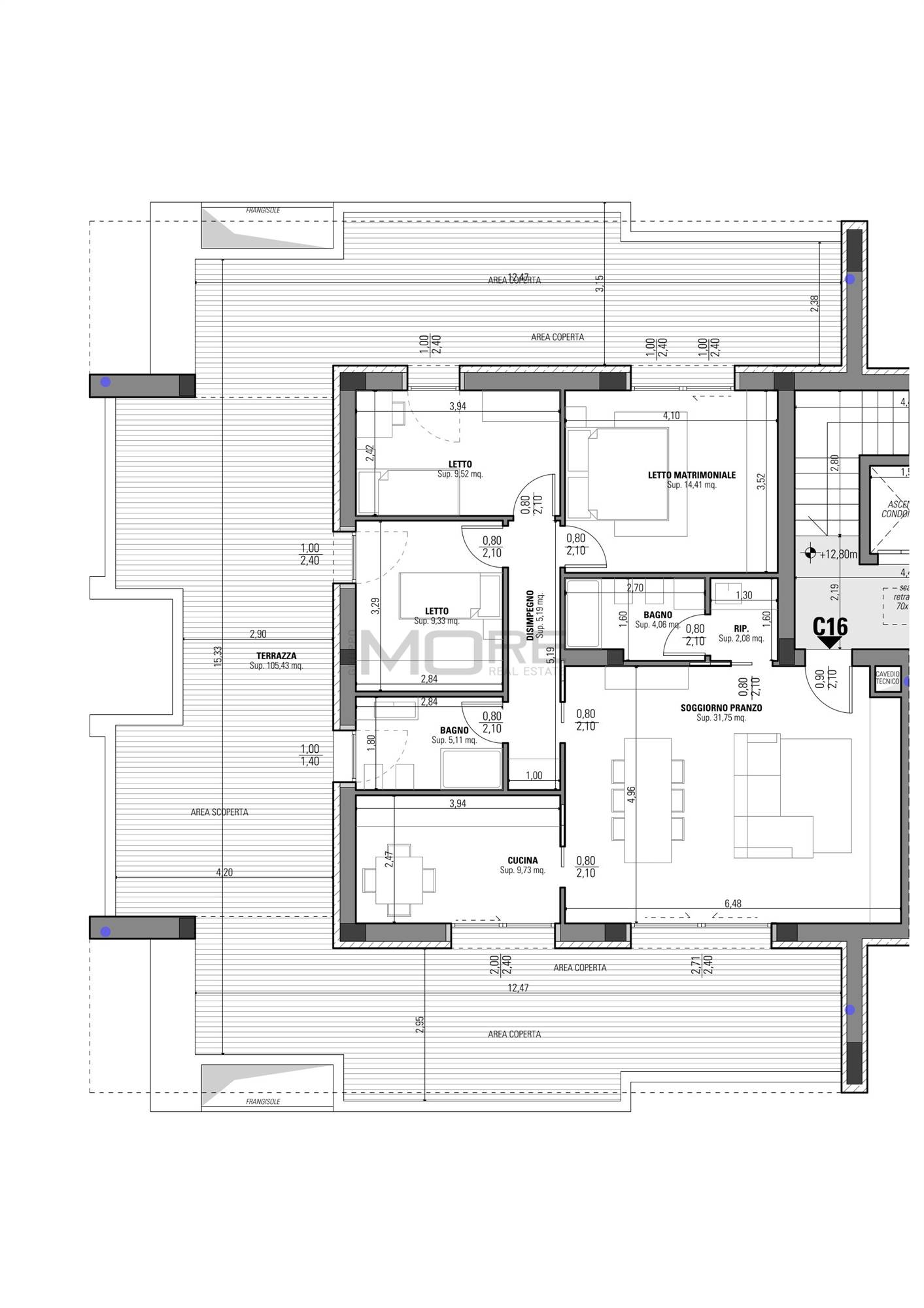 Appartamento così disposto: soggiorno/pranzo, cucina, disimpegno, tre camere da letto (con affaccio su terrazzo), due bagni, ripostiglio e ampio terrazzo perimetrale.