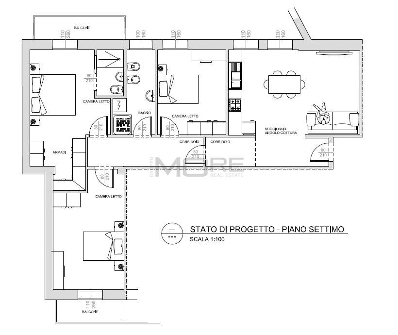 App.to così disposto: ingresso, soggiorno con cucina a vista, dis. notte, tre camere da letto (due dotate di balcone) e due bagni (uno cieco).