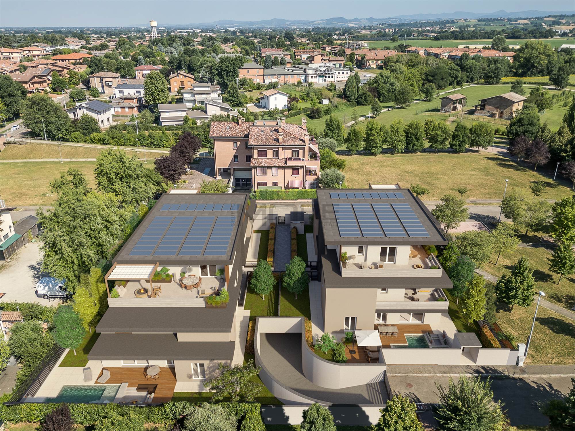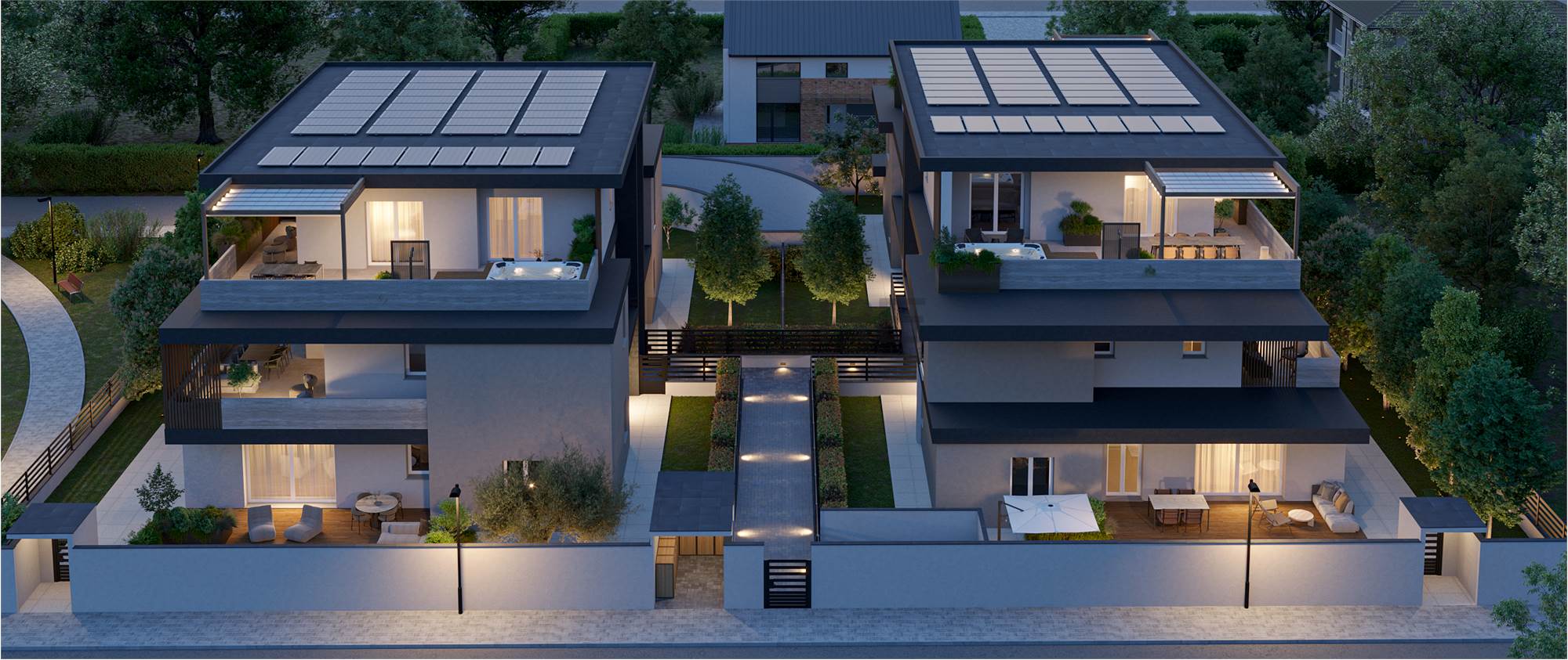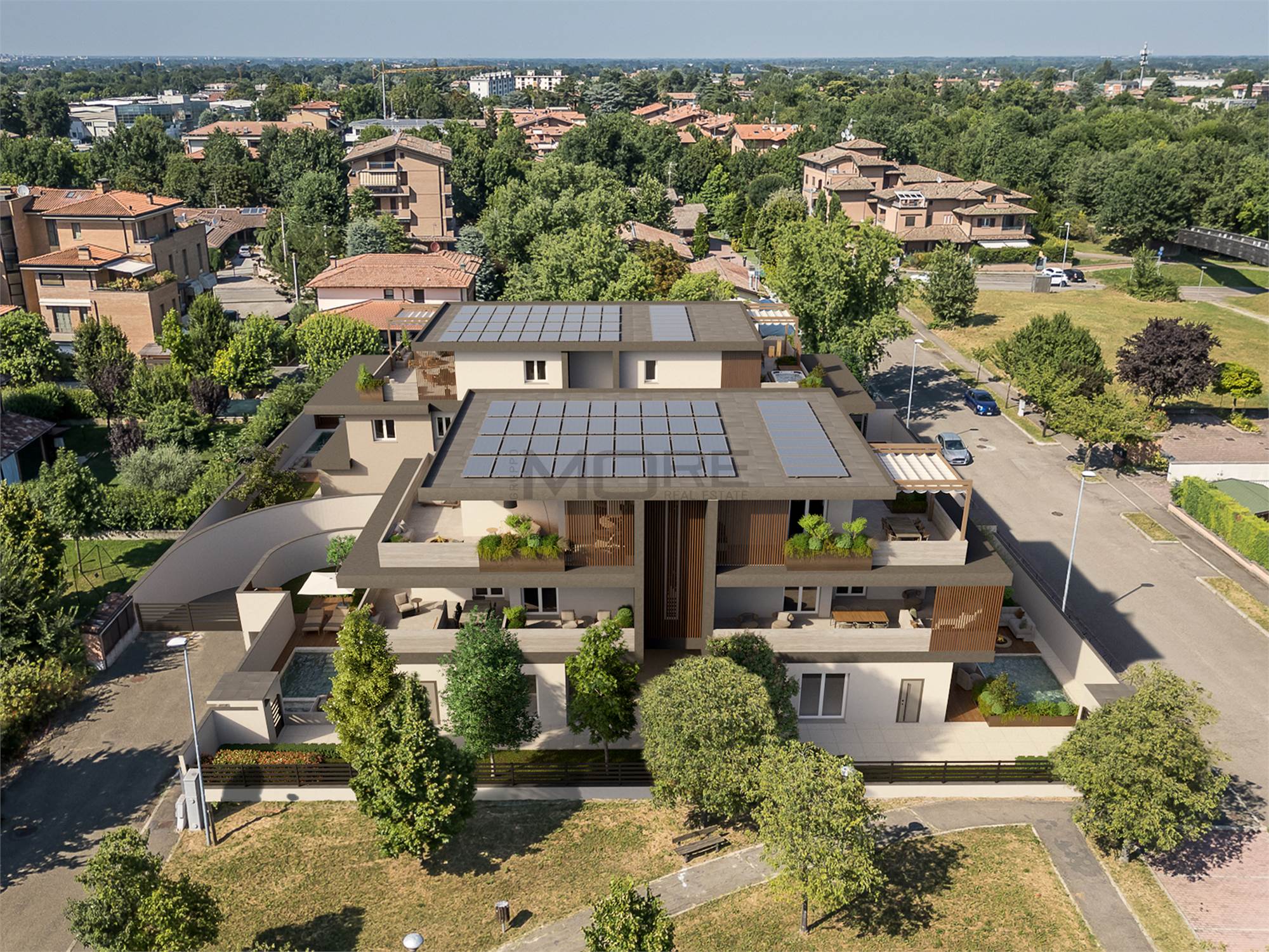 Ogni edificio è composto da 2 maisonettes con giardino e piscina privata, due appartamenti e un attico.