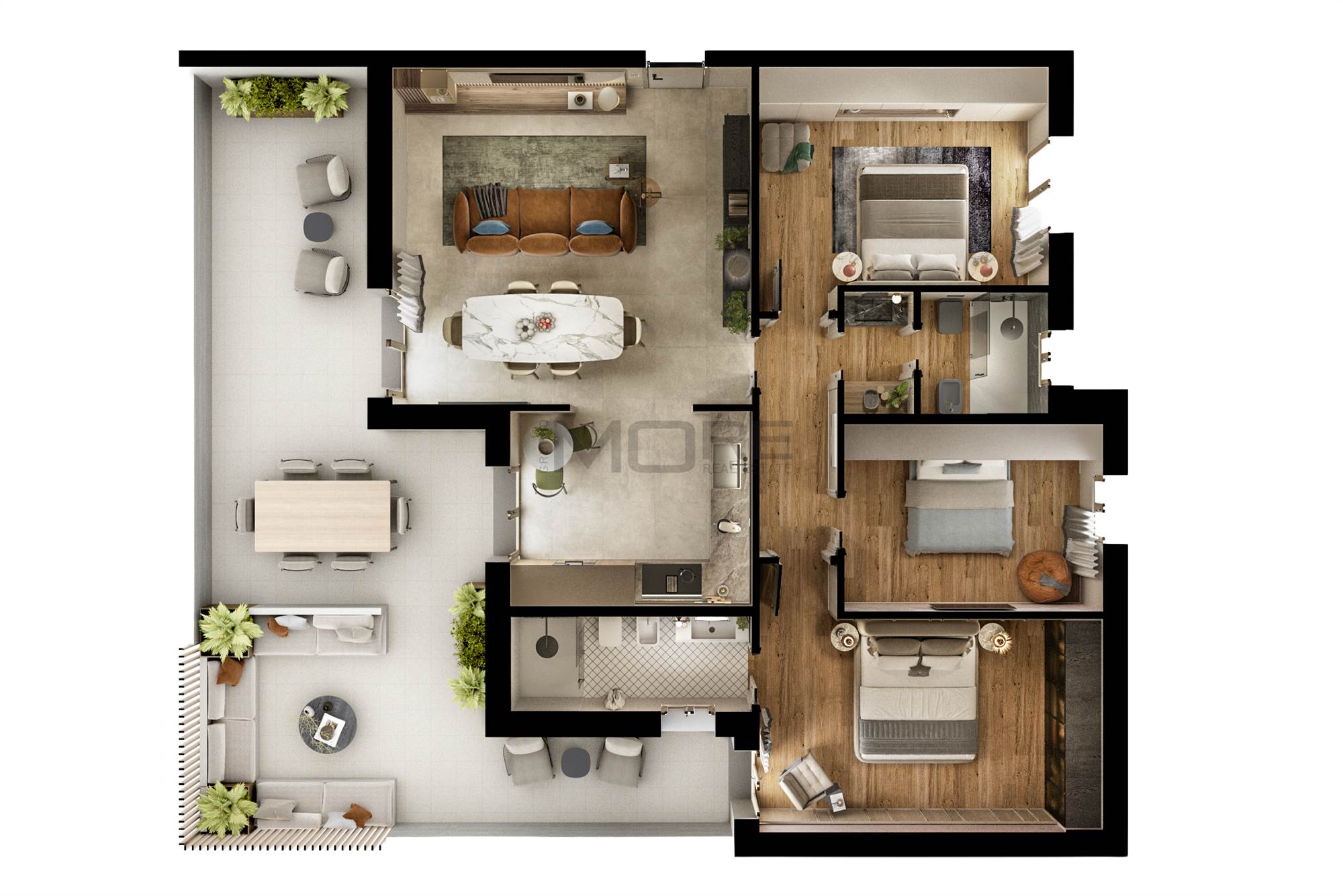 soluzione C2 APPARTAMENTO al primo piano composto da ampia zona soggiorno/pranzo con affaccio su loggia coperta, cucina, tre camere da letto, due bagni (di cui uno en-suite), garage e posto auto coperto.