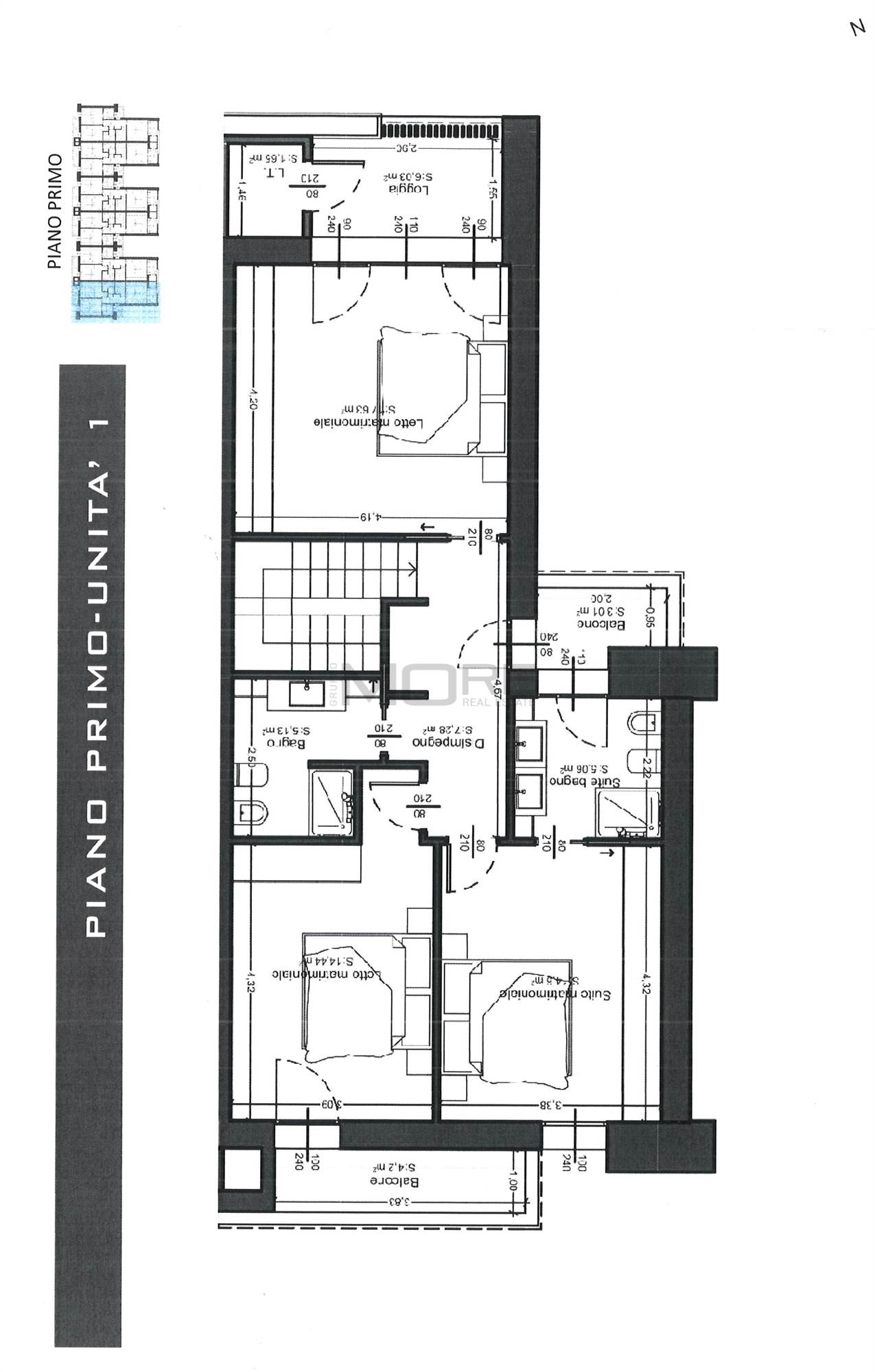 P.1. Tre camere matrimoniali, due bagni, ripostiglio, due balconi, loggia, locale tecnico.
