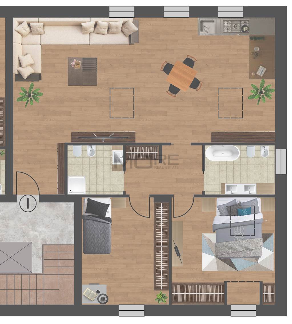 VX2789 Tip. I - Appartamento di mq 140 posto al piano secondo con giardino privato di 120 mq e posto auto compreso nel prezzo. Composto da: P2 (121 mq): sala con angolo cottura, 2 camere, 2 bagni. (non c'è garage, ma posto auto privato)