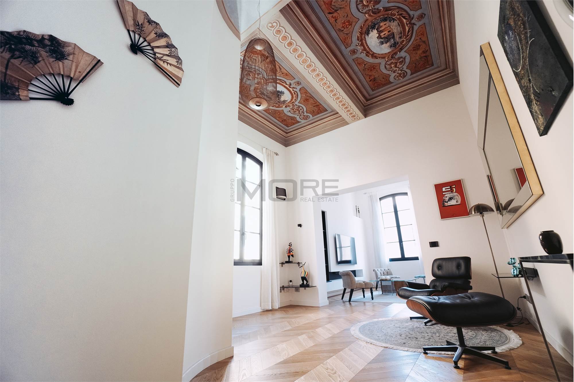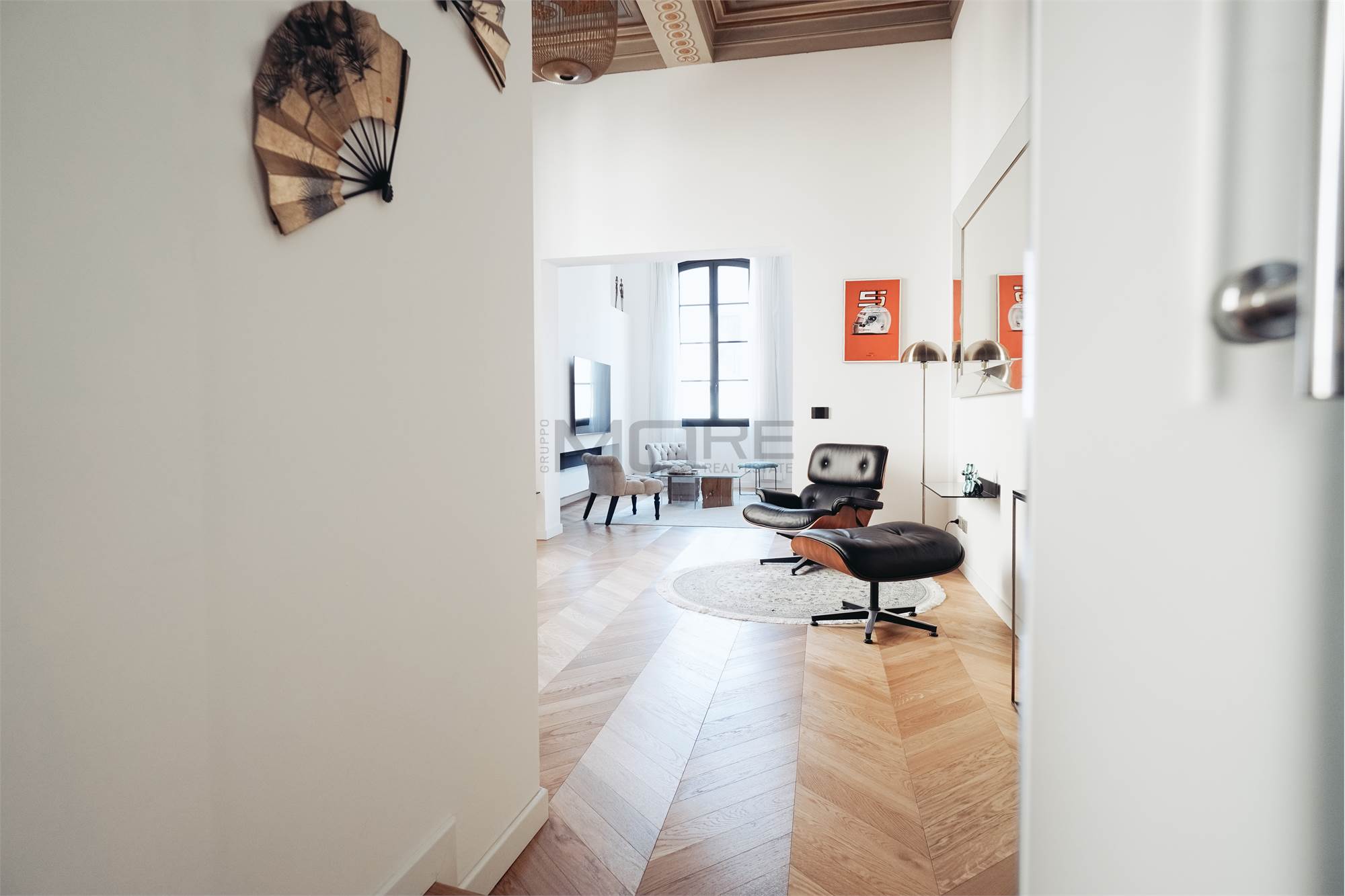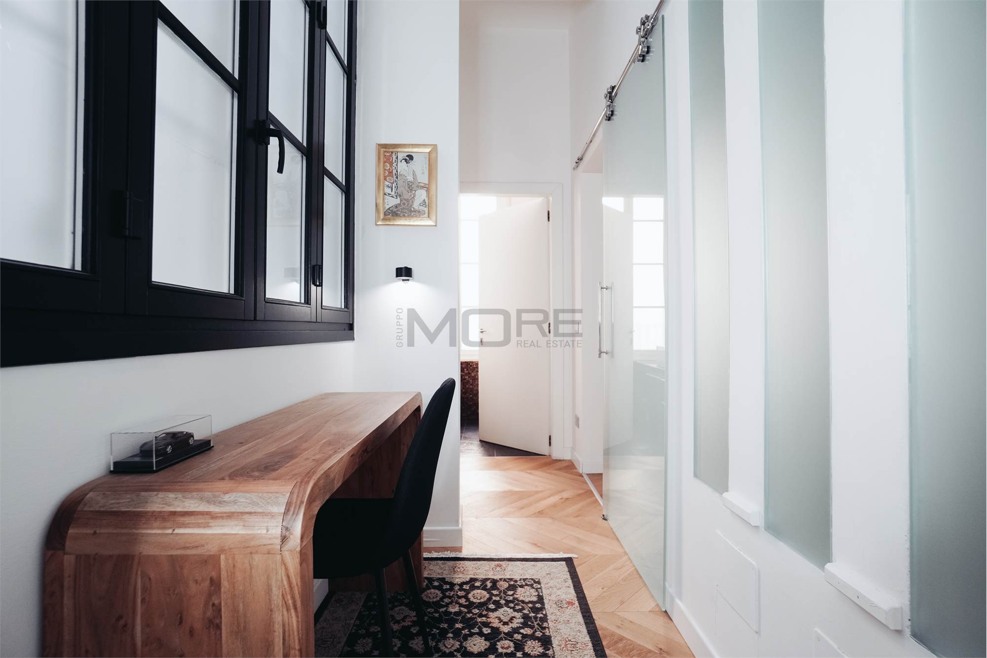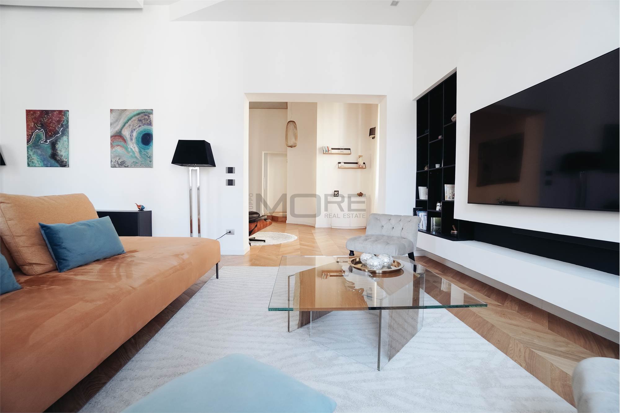 L'appartamento di 145 mq è stato pensato per avere una zona giorno estremante ampia e di rappresentanza, dedicando a questa la maggior parte della superficie dell'immobile, rimangono cosi una camera e mezzo, 3 bagni e uno studio. L'immobile è posto al secondo piano senza ascensore.