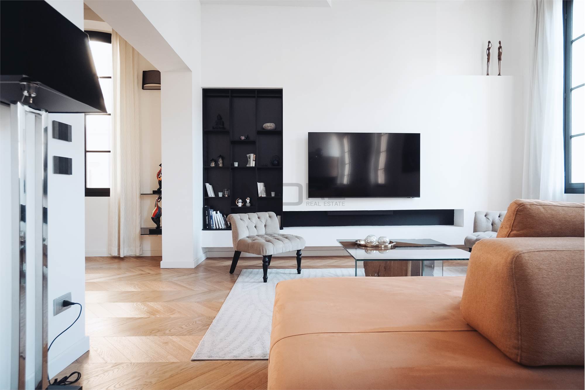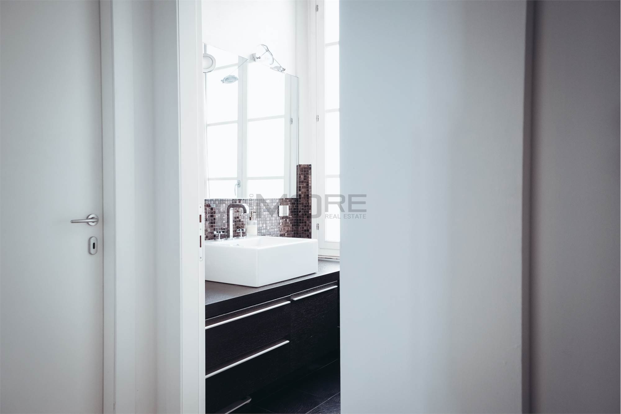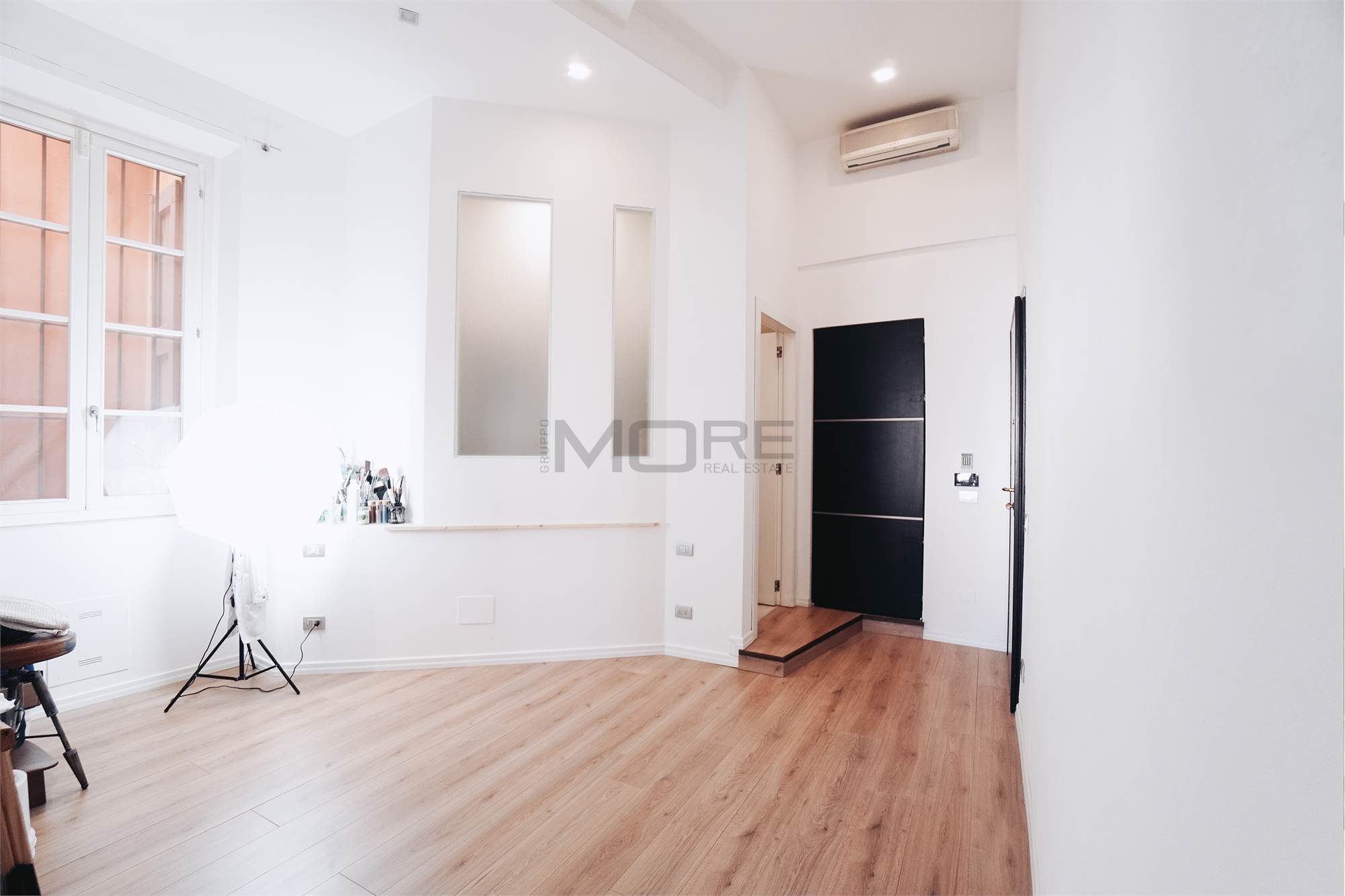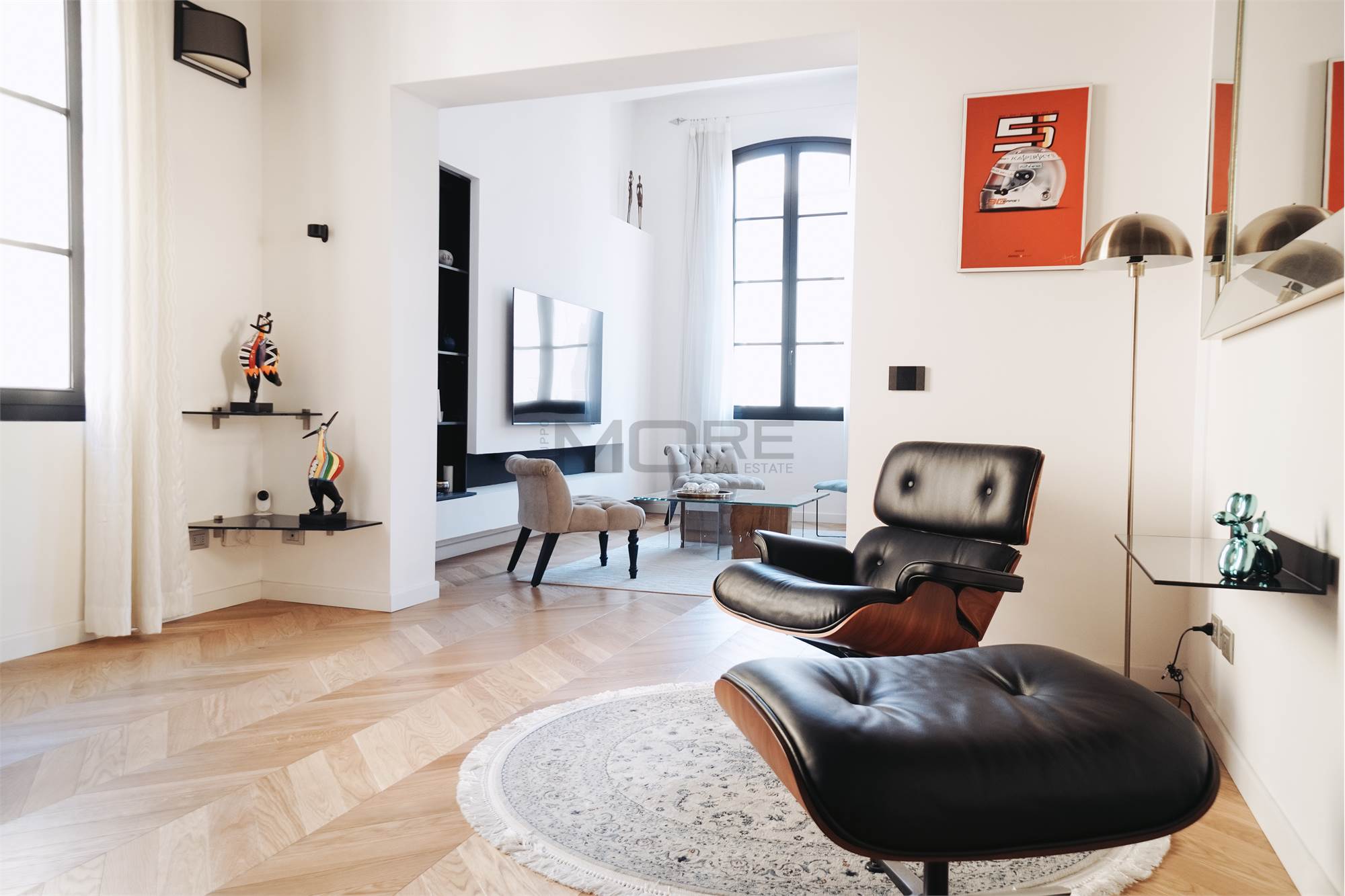 L'appartamento di 145 mq è stato pensato per avere una zona giorno estremante ampia e di rappresentanza, dedicando a questa la maggior parte della superficie dell'immobile, rimangono cosi una camera e mezzo, 3 bagni e uno studio. L'immobile è posto al secondo piano senza ascensore.