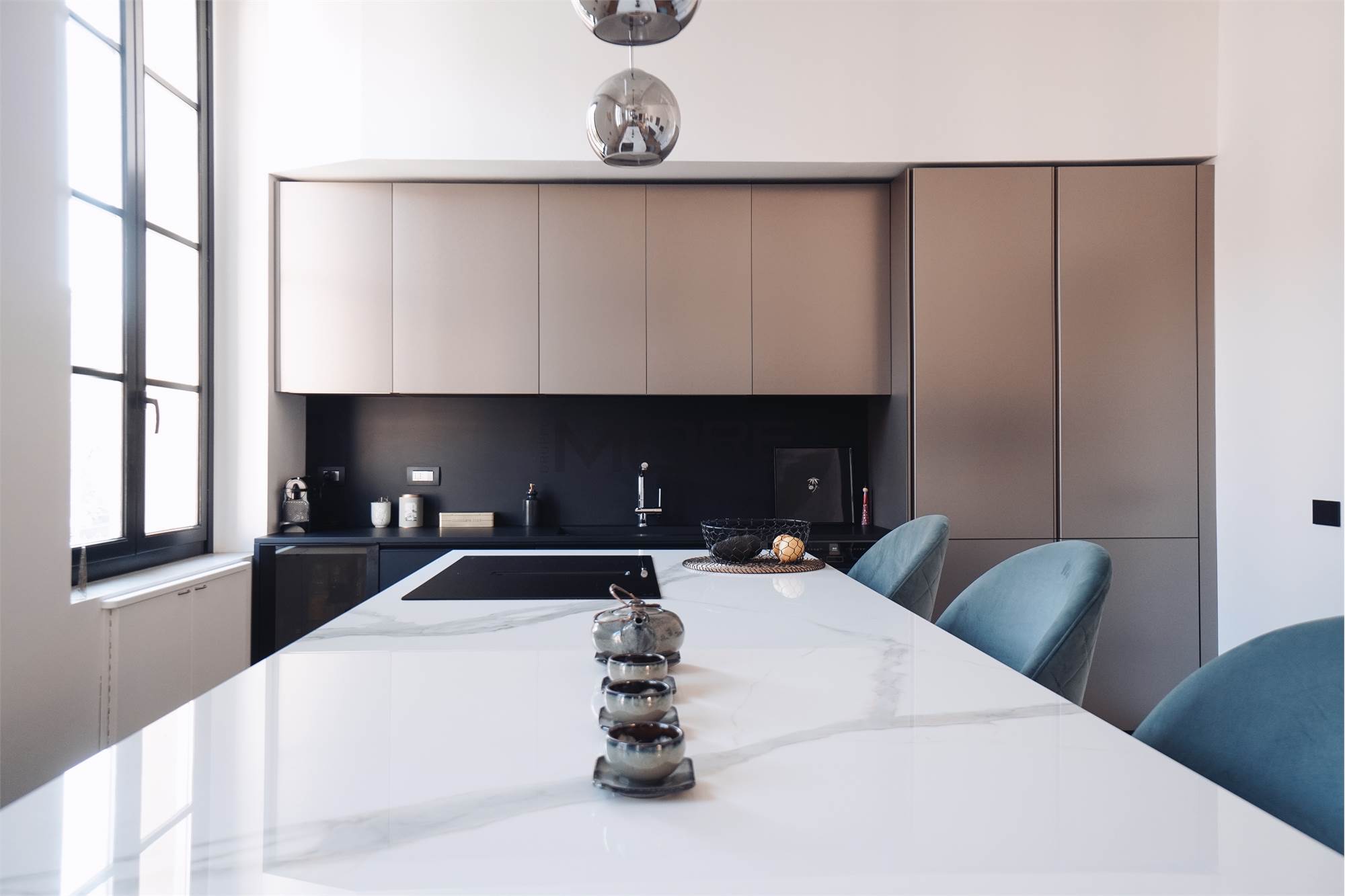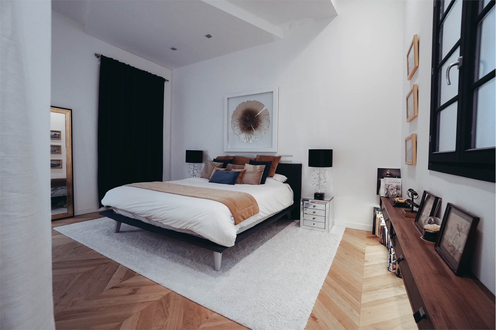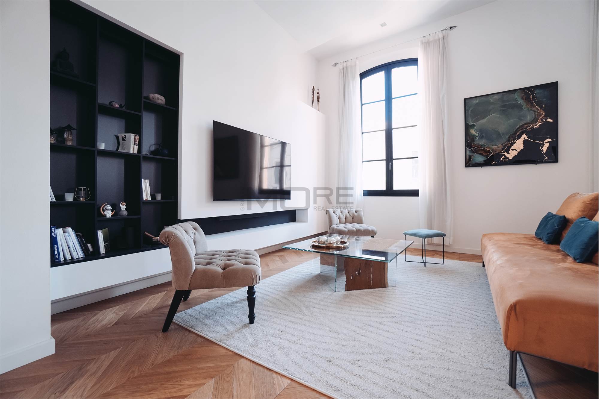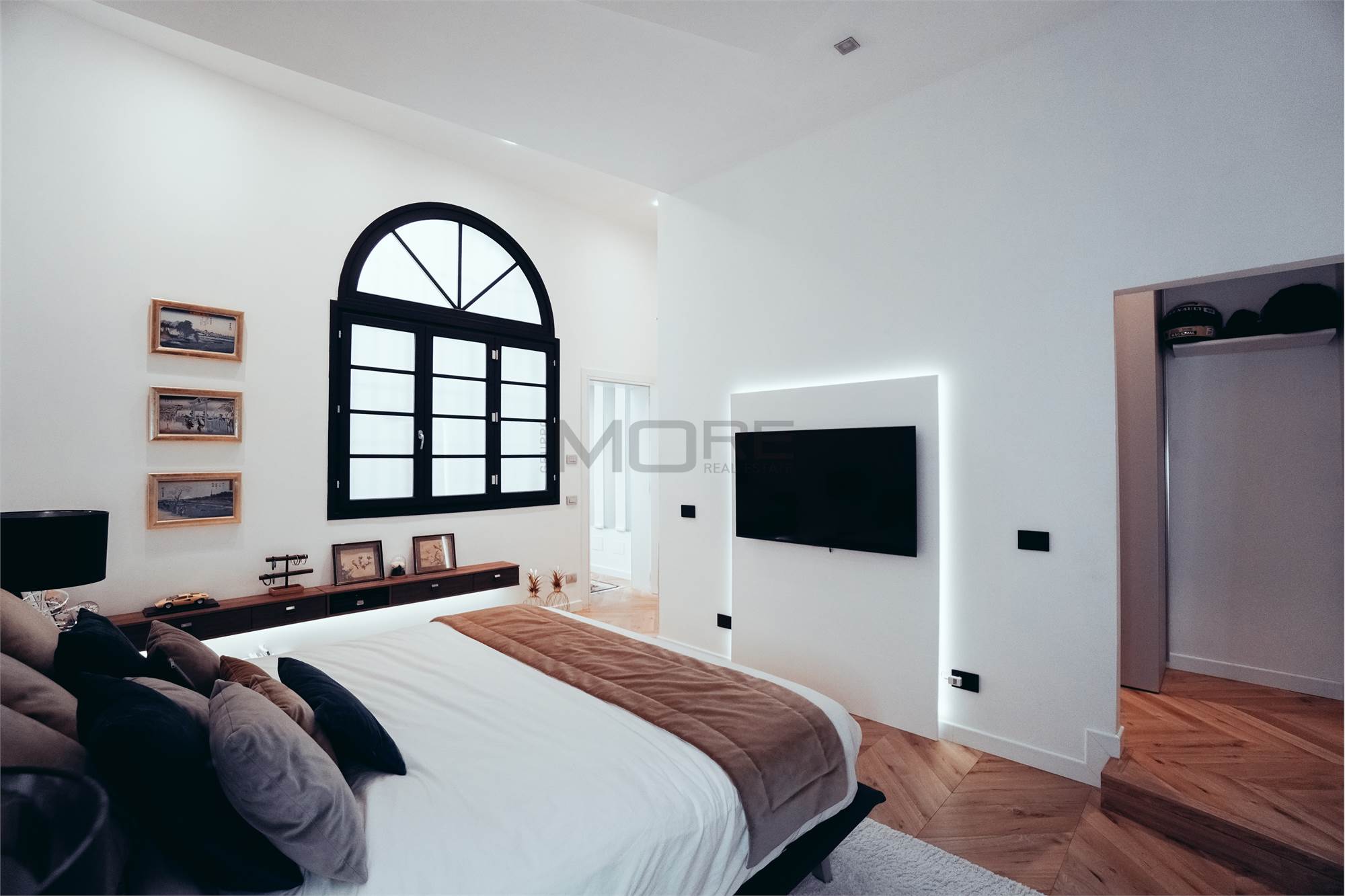 L'appartamento di 145 mq è stato pensato per avere una zona giorno estremante ampia e di rappresentanza, dedicando a questa la maggior parte della superficie dell'immobile, rimangono cosi una camera e mezzo, 3 bagni e uno studio. L'immobile è posto al secondo piano senza ascensore.